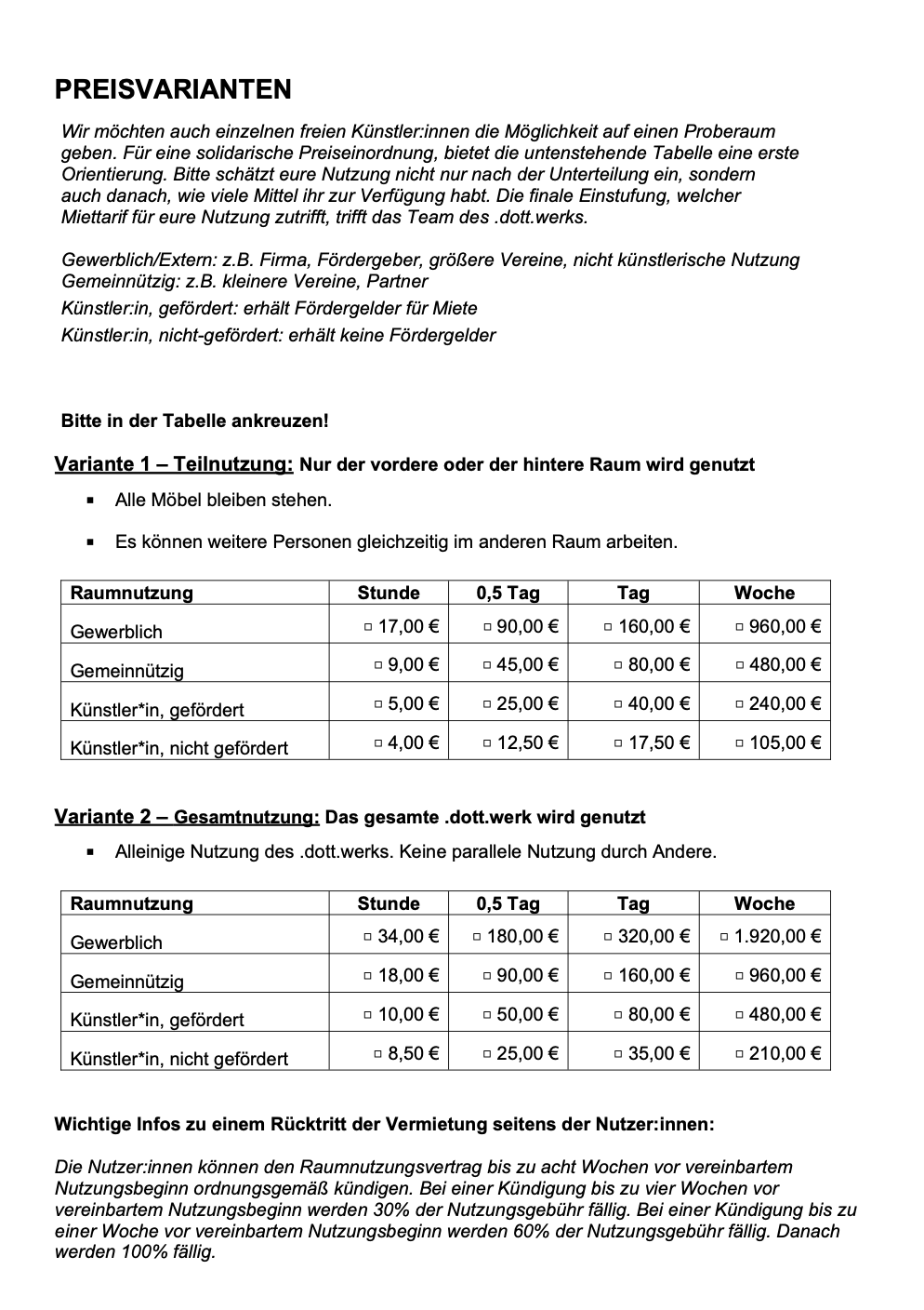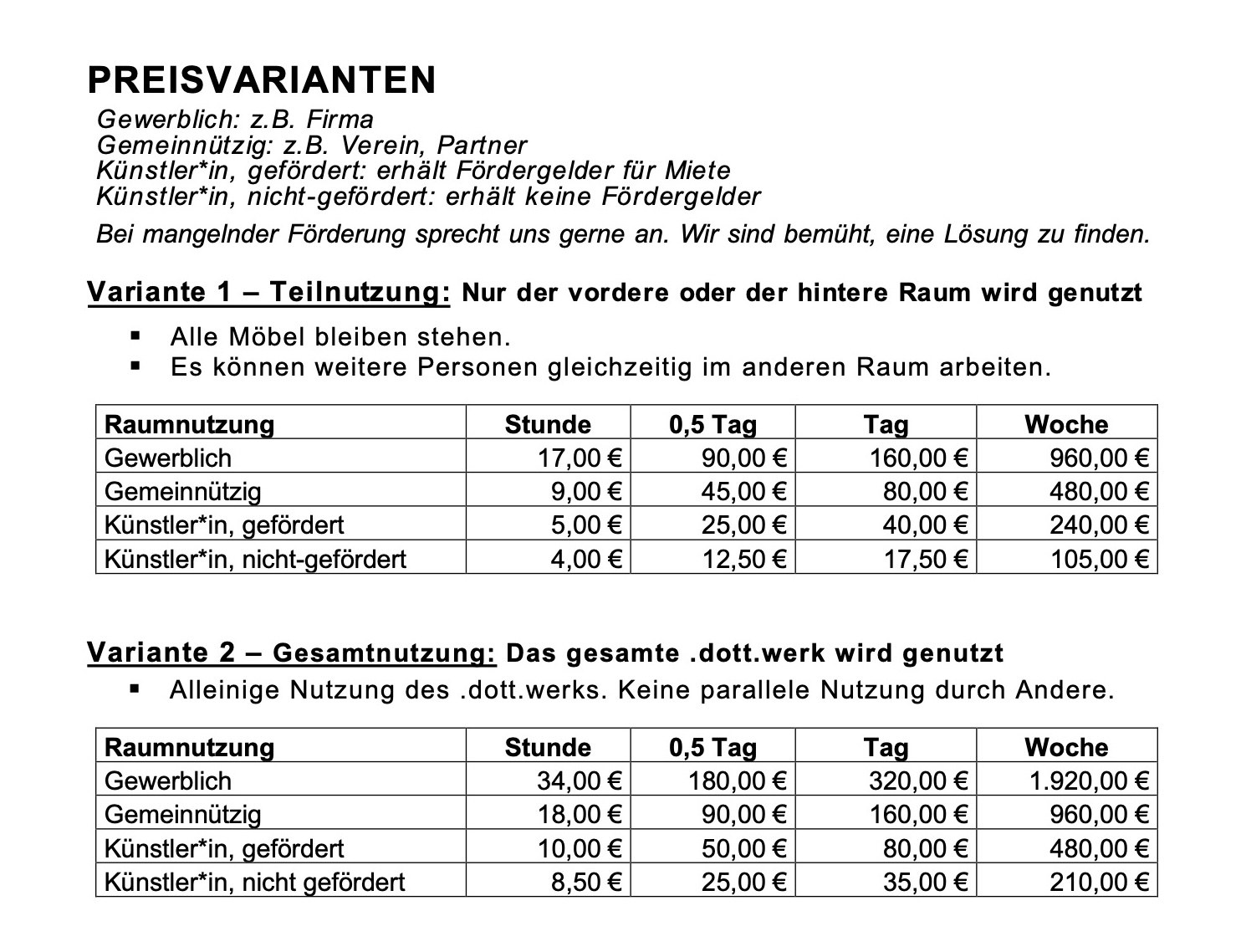 bitte direkt an Birgit Götz (+49 177 2592176 / goetz[at]dott-netzwerk.de) richten. Die Preise für die Nutzung des .dott.werks sind je nach Nutzungsart, Zweck und Umfang gestaffelt und werden nach persönlicher Absprache festgelegt. Detaillierte Infos zu den Miet- und Nutzungsbedingungen werden nach der ersten Anfrage zur Verfügung gestellt.